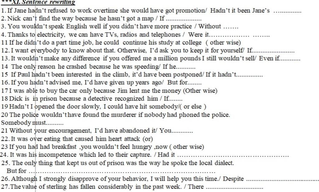 1. If Jane hadn't refused to work overtime she would have got promotion/ Hadn't it been Jane's