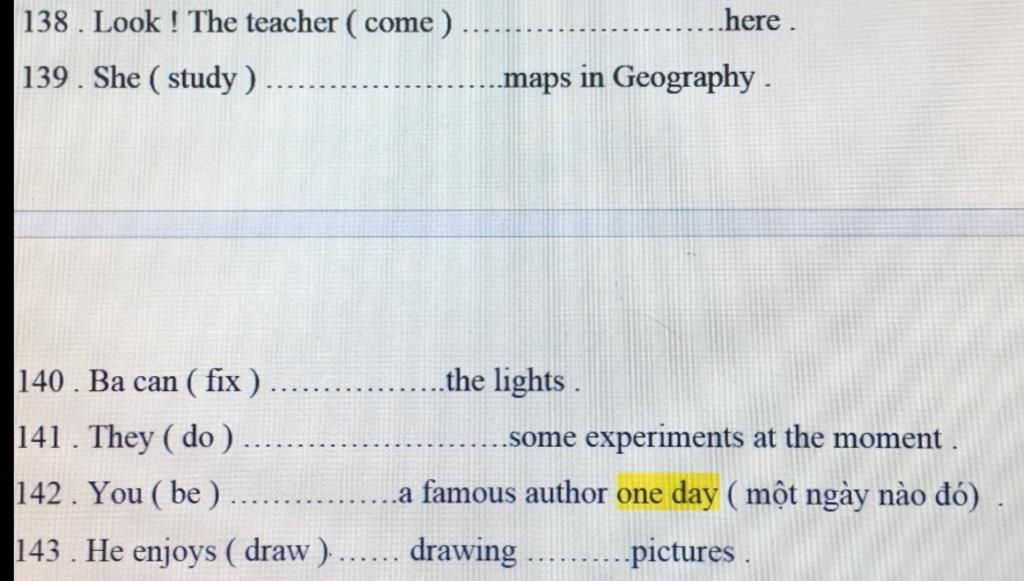 143. He enjoys drawing the pictures ( sau enjoy = V_ing, picture số nhiều nên dùng the )