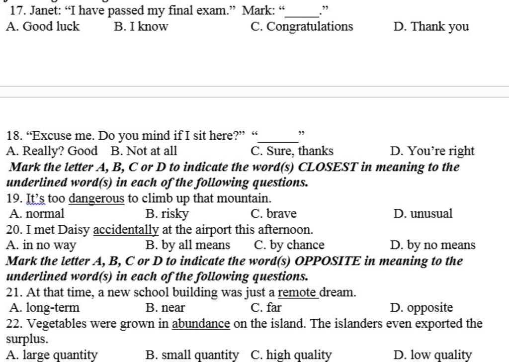 21. B remote : xa xôi, hẻo lánh >< near : gần