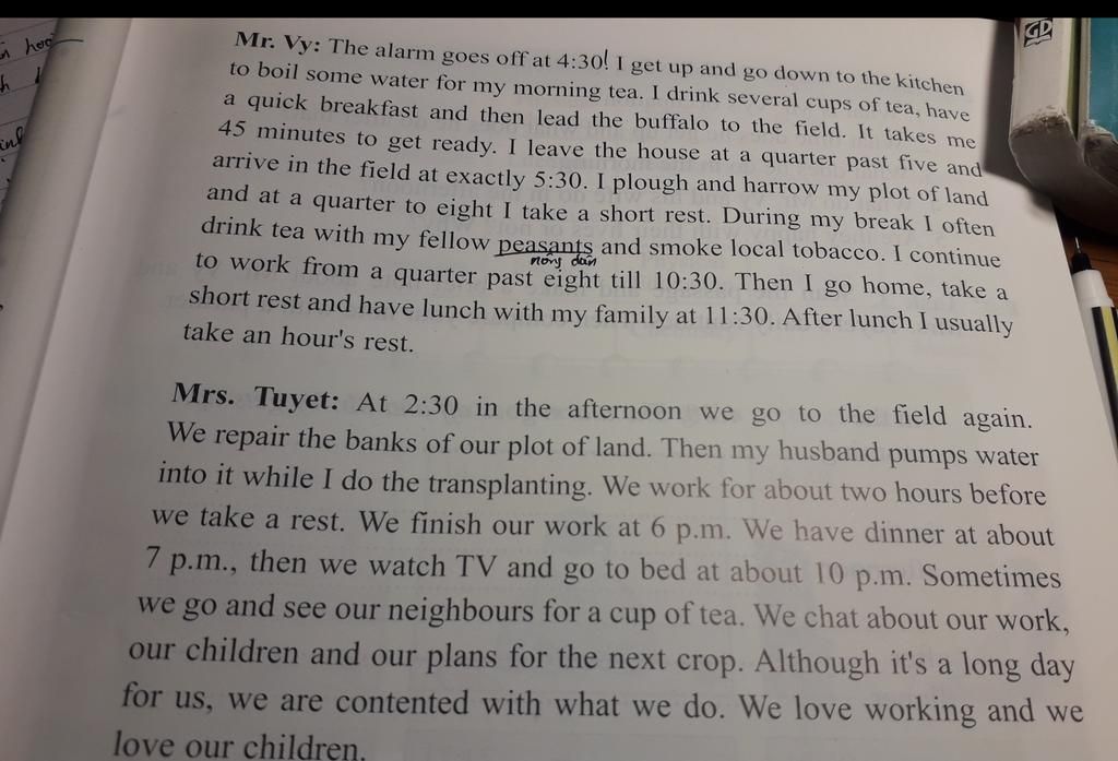 anh Vy : Chuông báo thức kêu 4h30 sáng .tôi dậy và xuống bếp đun nước pha trà buổi sáng Tôi uống vài tách trà , ăn sáng nhanh chóng và dắt trâu ra đồng .Tôi mất 45p để sẵn sàng.Tôi rời khỏi nhà lúc 5h kém 15p sáng và đến cánh đồng lúc 5h30 . Tôi cày và bừa mảnh đất của mình và đến 8h kém15 tôi nghỉ ngơi một chút . Trong thời gian nghỉ ngơi tôi thường uống trà với những người nông dân và hút thuốc lá địa phương Tôi bắt đầu làm việc từ 8h15 cho tới lúc 10h30 .Sau đó tôi về nhà nghỉ ngơi một chút và ăn trưa với gia đình lúc 11h30.Sau buổi trưa ,tôi thường nghỉ ngơi một giờ.