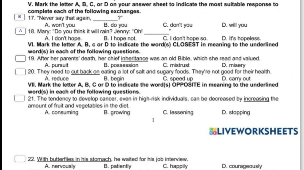 with butterflies in his stomach (lo lắng,bồn chồn)><happily (bình tĩnh)