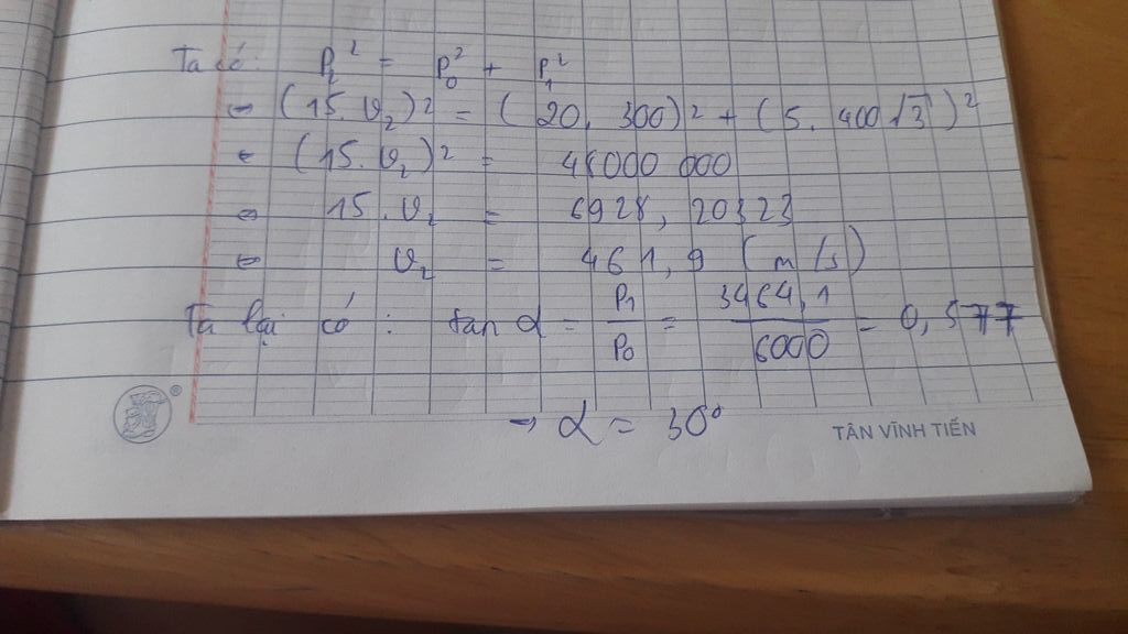 \(P_2^2 = {P^2} + P_1^2 < = > {(15.{v_2})^2} = {(20.300)^2} + {(5.400\sqrt 3 )^2} = > {v_2} = 462m/s\)
