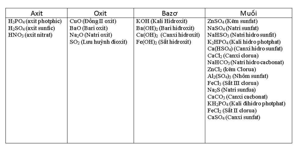 Hãy cho biết các hợp chất sau thuộc loại hợp chất nào và gọi tên chúng: KOH, Ba(OH)2, ZnSO4, Na2SO4, NaHSO3, K2HPO4, Ca(HSO4)2, H3PO4, CaCl2, H2SO4, NaHCO3, Ca(OH)2, ZnCl2, HNO3, Al2(SO4)3, FeCl3, Na2S, fe(OH)2, CaCO3, KH2PO4, CuO, FeCl2, BaO, Na2O,SO2, CaSO4
