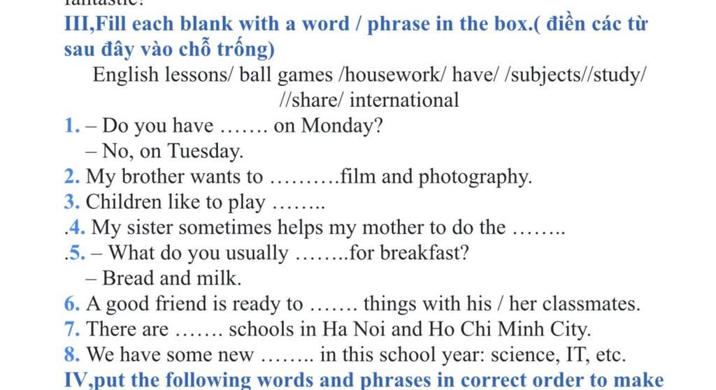 5. have (Dịch: Bạn thường ăn gì cho bữa sáng?/ Bánh mì và sữa)
