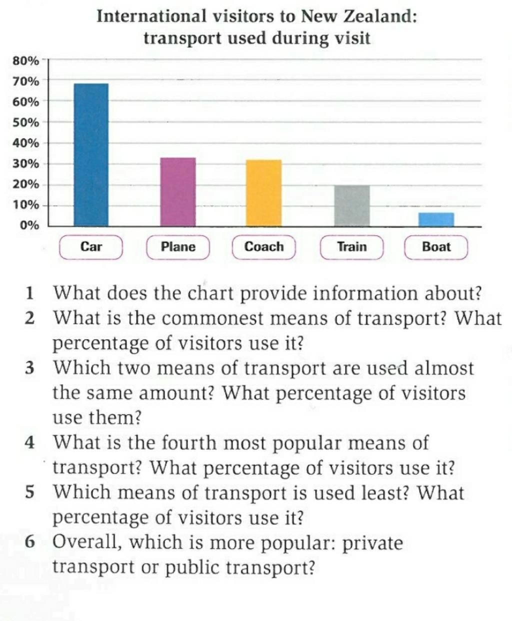 1. The bar chart shows the percentage of different means of transport international visitors used during visit to New Zealand.