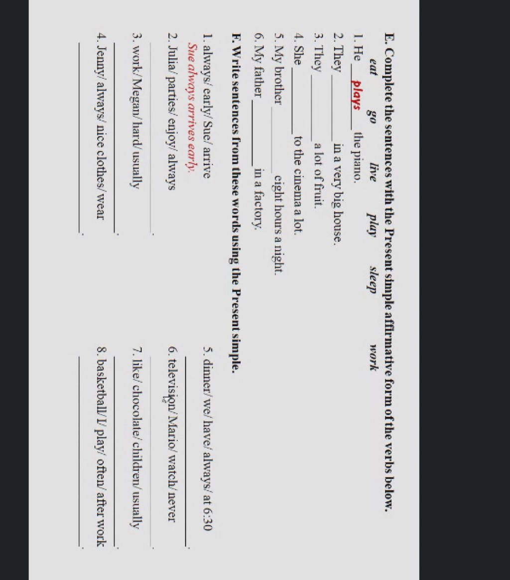 Giải thích chung : Khi ta dịch các từ ra thì ta sẽ có thể ghép các từ lại với nhau phù hợp hơn. Các động từ phải chia từ theo Thì Hiện tại đơn.