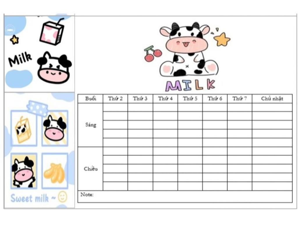 Vẽ lại ik hình này nha mn . Thêm màu, vẽ thêm j vào tùy thích nhưng phải đẹp . Phía trên chừa chỗ trống để vẽ chữ TKB lớp và n học lên đó nha . Ko cần ghi lớp 8 vì các bạn vẽ xong cx còn để laih học . vẽ thêm bình sữa chuối nha ( ko bắt buộc ). Full màu và full line