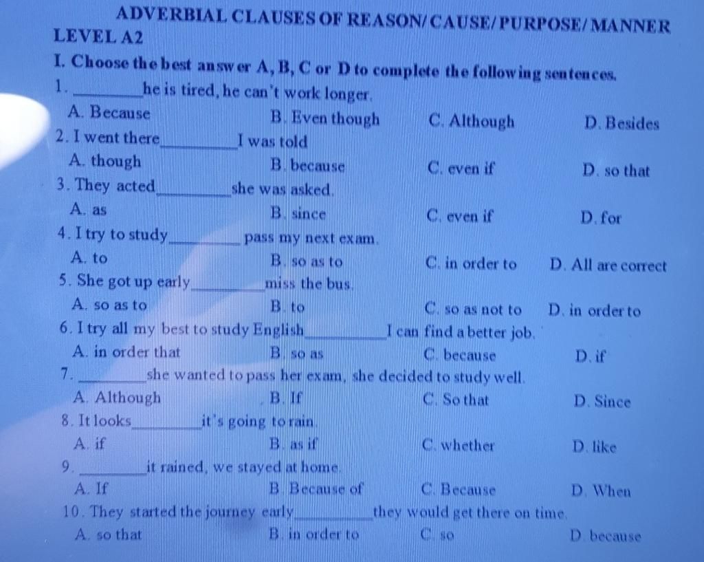 1. A. Because ( Because + clause: Bởi vì anh ấy mệt, anh ấy không thể làm lâu hơn. )