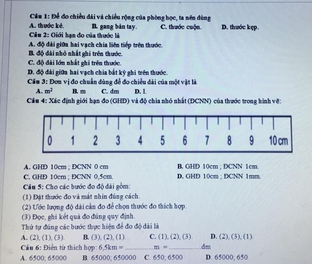 Câu 1: Để đo chiều dài và chiều rộng của phòng học, ta nên dùng