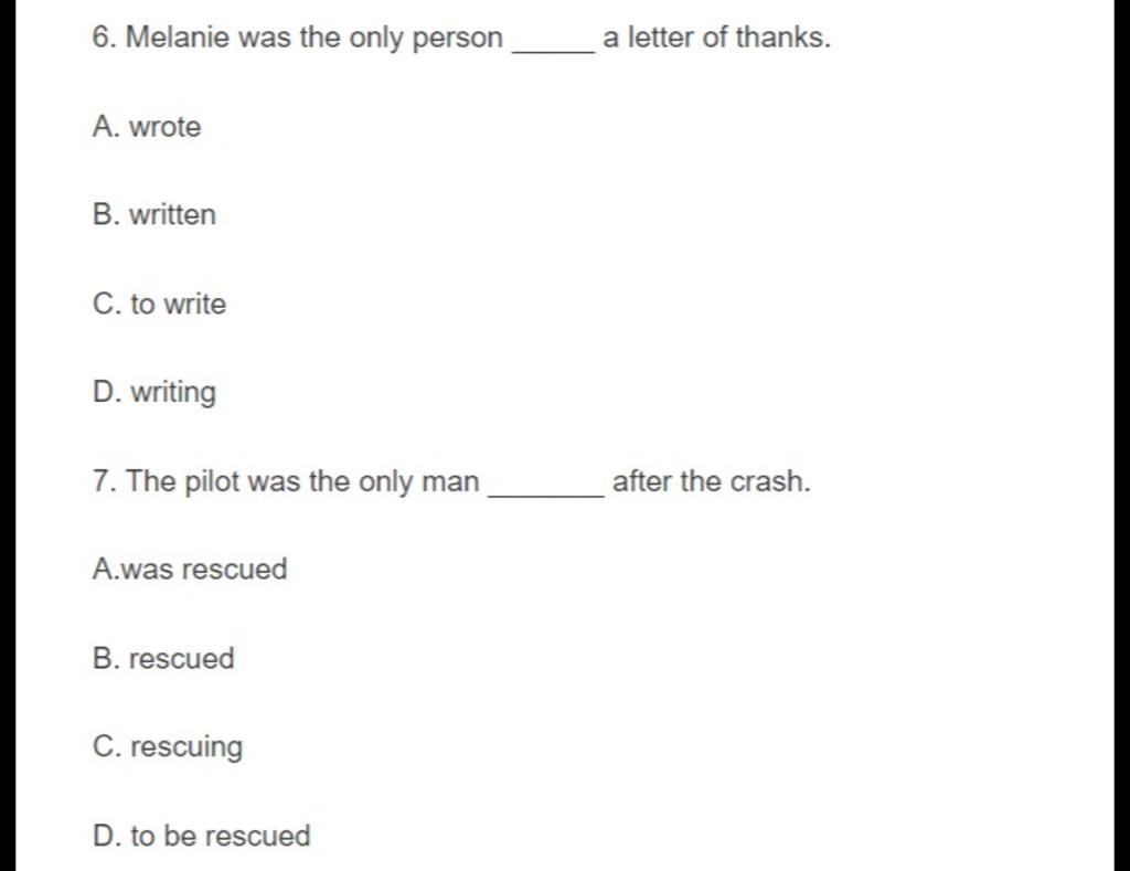 D.to be rescured( tương tự câu trên,=> to-inf:Vì danh từ đứng trước có từ the only bổ nghĩa,chỉ đối tượng,hành vi mang tính duy nhất)