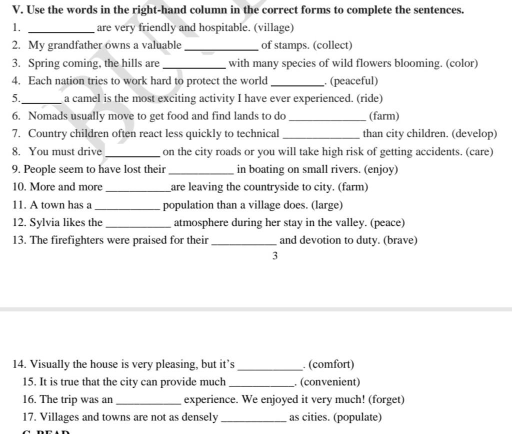 1. villagers 2.collection 3.colorful 4.peace 5.riding 6.farm 7.development 8.carefully 9.enjoyment 10.farmers 11.large 12.peaceful 13.bravory