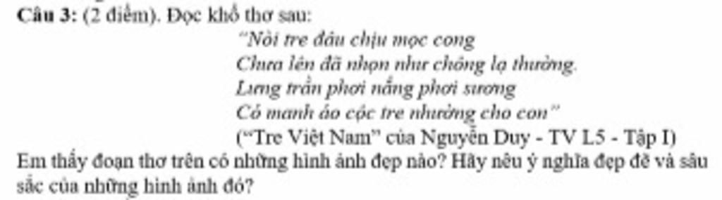 Em thấy đẹp ở hai hình ảnh : " Nòi tre đâu chịu mọc cong " và " Lưng trần phơi nắng phơi sương " . Hai hình ảnh này có ý nghĩa thể hiện cho người mẹ luôn vất vả làm lụng để nuôi chúng ta thành tài . Mẹ đã phải phơi nắng , phơi sương sao cho chúng ta có đủ cái ăn , cái mặc .Ngoài ra , hình ảnh " đâu chịu mọc cong " cũng thể hiện ý chí không chịu khuất phục trước khó khăn . Qua đó , hai hình ảnh này cũng truyền tải ý nghĩa phải biết trân trọng và yêu thương mẹ chúng ta .