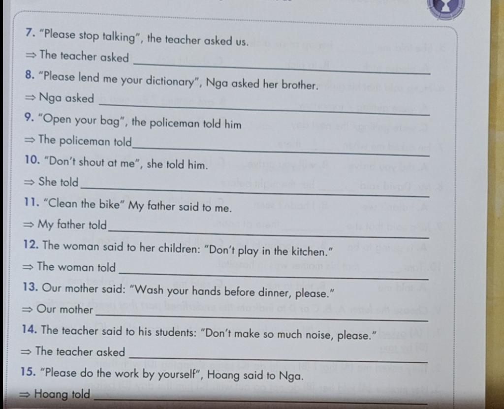 `7.` The teacher asked us to please stop talking.