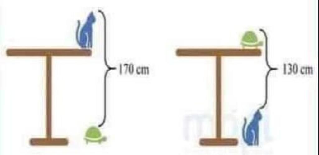 Giải bài toán bằng cách lập hệ phương trình. Bạn hãy đặt chiều cao của bàn là B, chiều cao rùa là R, chiều cao mèo là M. Ở hình 1 ta có B + M – R = 170. Ở hình 2 ta có B + R – M = 130. Giải hệ 2 phương trình 3 ẩn ta được đáp án là 150cm vì 170+130:2=150(cm)