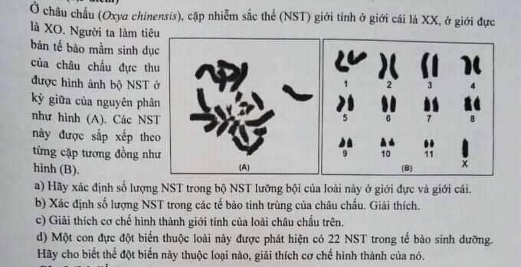 b. Châu chấu đực có bộ NST giới tính là XO, giảm phân tạo ra 2 loại giao tử là X và O nên số lượng NST trong các tế bào tinh trùng của châu chấu có thể là 11 NST (do chứa NST giới tính O) hoặc 12 NST (có chứa NST NST giới tính X).