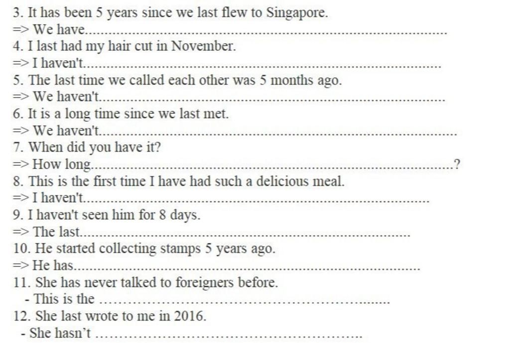 -> S + last + V2 + in + mốc thời gian = S + haven't / hasn't + VPII + since + 1 mốc thời gian
