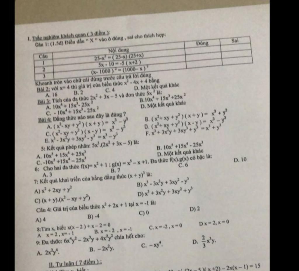 $\displaystyle \begin{array}{{>{\displaystyle}l}} Câu\ 1:\\ 1.\ 25-x^{2} =( 5-x)( 5+x) \Leftrightarrow 1\ Sai\\ 2.\ 5x-10=-5( x+2) \Leftrightarrow 2\ Đúng\\ 3.\ ( x-1000)^{2} =( 1000-x)^{2} \Leftrightarrow 3\ Đúng\\ Câu\ 2:\\ x=4\ thì\ x^{2} -4x+4=( x-2)^{2} =( 4-2)^{2} =2^{2} =4\Leftrightarrow C\ đúng\\ Câu\ 3:\\ \left( 2x^{2} +3x-5\right) \ .5x^{2} =10x^{4} +15x^{3} -25x^{2} \Leftrightarrow A\ đúng\\ Câu\ 4:\\ x^{3} -y^{3} =( x-y)\left( x^{2} +xy+y^{2}\right) \Leftrightarrow D\ đúng\ \\ Câu\ 5:\\ 5x^{3}\left( 2x^{2} +3x-5\right) =10x^{5} +15x^{4} -25x^{3} \Leftrightarrow B\ đúng\\ Câu\ 6:\\ f( x) .g( x) =\left( x^{2} +1\right) .\left( x^{5} -x+1\right) =x^{7} -x^{3} +x^{2} +x^{5} -x+1\\ \Leftrightarrow Bậc\ của\ đa\ thức\ f( x) .g( x) \ là\ 7\Leftrightarrow B\ đúng\\ Câu\ 7:\\ ( x+y)^{3} =x^{3} +3x^{2} y+3xy^{2} +y^{3} \Leftrightarrow D\ đúng\\ Câu\ 4:\\ Với\ x=-1\ thì\ x^{2} +2x+1=( x+1)^{2} =( -1+1)^{2} =0\\ Câu\ 8:\\ x( x-2) +x-2=0\Leftrightarrow ( x+1)( x-2) =0\\ \Leftrightarrow x=-1\ hoặc\ x=2\Leftrightarrow \ A\ đúng\\ Câu\ 9:\\ 6x^{4} y^{2} -2x^{3} y+4x^{2} y^{2} =-2x^{2} y\left( -3x^{2} y+x-2y\right)\\ \Leftrightarrow Đa\ thức\ trên\ chia\ hết\ cho\ -2x^{2} y\Leftrightarrow B\ đúng \end{array}$