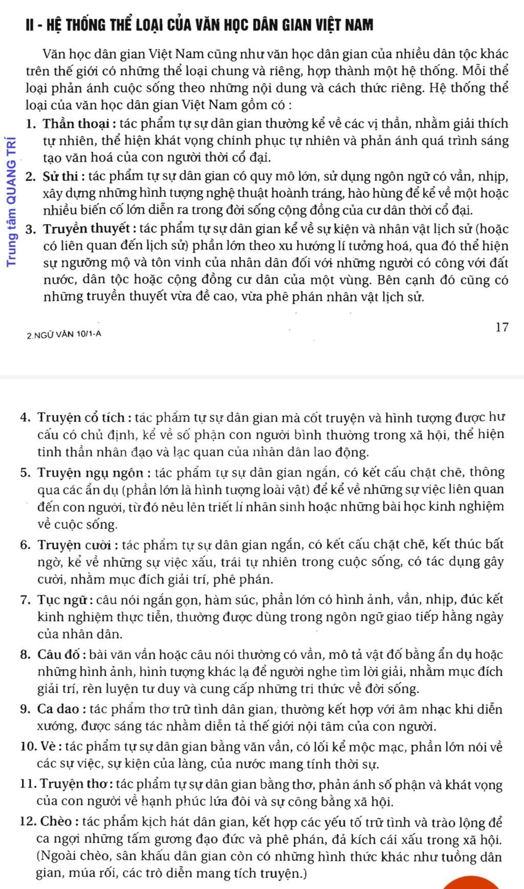 1. 2. Các thể loại chính: thần thoại, sử thi, truyền thuyết, truyện cổ tích, truyện ngụ ngôn, truyện cười, tục ngữ, câu đố, ca dao, truyện thơ... và các loại hình diễn xướng như chèo, tuồng, dân ca (sân khấu dân gian).