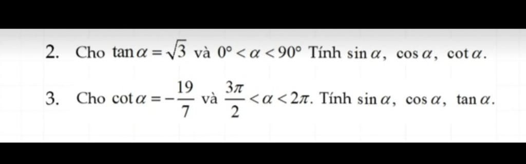 \tan a = - \dfrac{7}{{19}};\cos a = \dfrac{{19}}{{\sqrt {410} }};\sin a = - \dfrac{7}{{\sqrt {410} }}