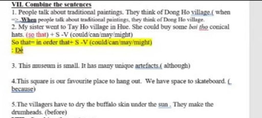 2. My sister went to Tay Ho village in Hue so that she could buy some bai tho conical hats. ( So that )