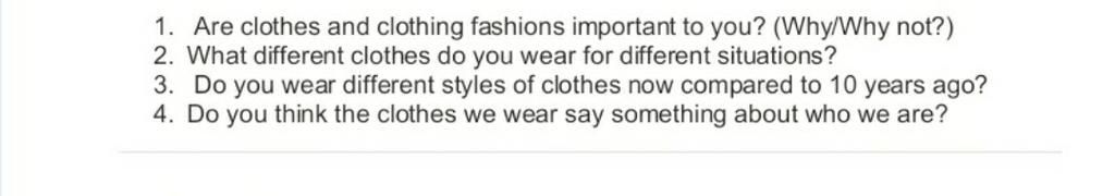 1. No, clothes and clothing fashions are not important to me. Because I prefer wearing clothes that are comfortable and practical to wearing fashionable clothes