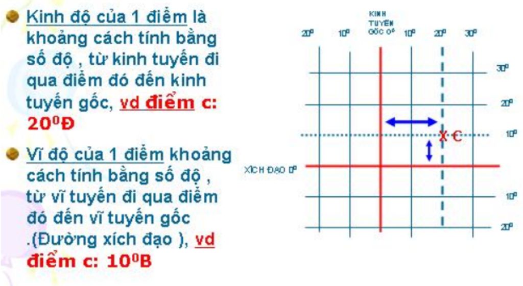 -Kinh độ của 1 điểm gọi là số độ chỉ khoảng cách từ kinh tuyến đi qua địa điểm đó đến kinh tuyến gốc