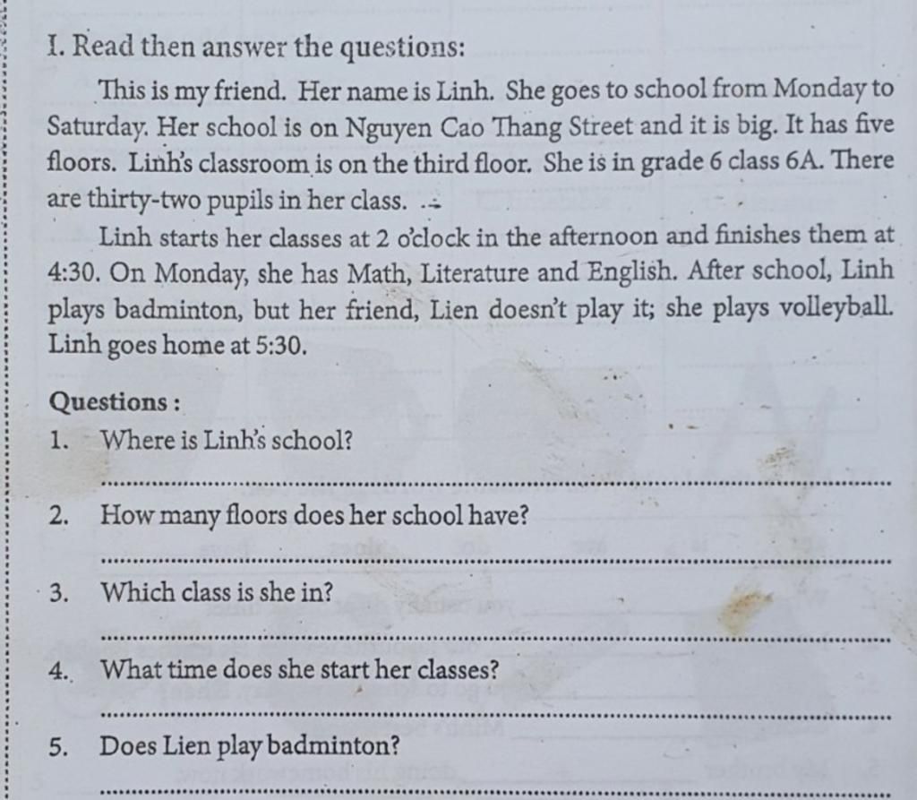 floors. Linh's classroom is on the third floor. She is in grade 6 class 6A. There