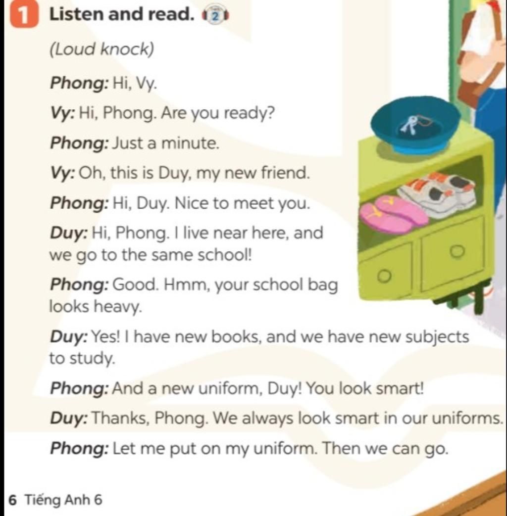 Vy: Xin chào, Phong. Bạn đã sẵn sàng (đi học) chưa?