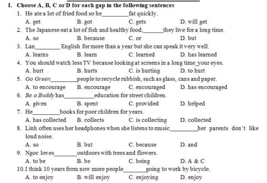 A. so B.because C.or D.but (Dịch: Người Nhật ăn nhiều cá và thức ăn tốt cho sức khỏe, do vậy họ sống lâu.)