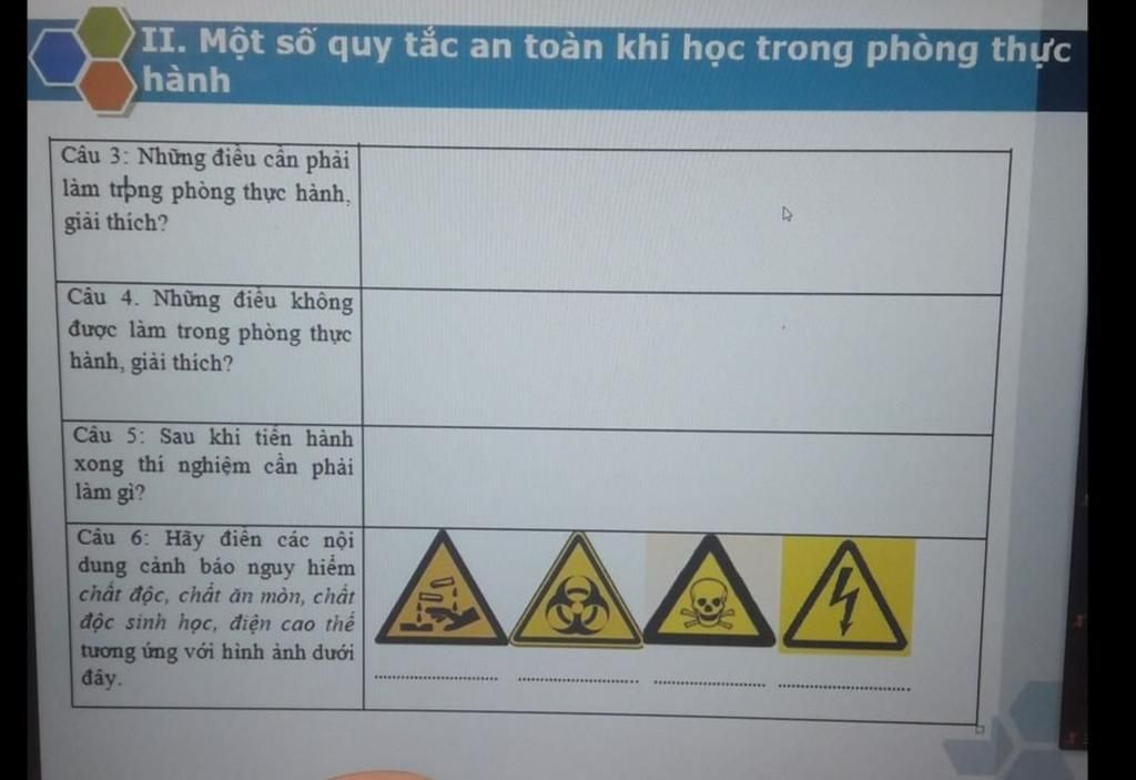 + Cần phân biệt được những kí hiệu cảnh báo nguy hiểm trong phòng thực hành để có thể nhận biết được nguy hiểm và có thể bào vệ bản thân trước những nguy hiểm đó.