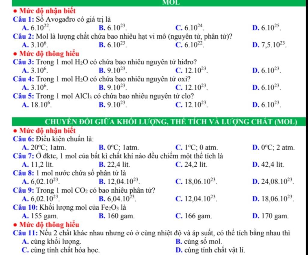 Câu 2 : 1 mol có số nguyên tử hoặc phân tử bằng số Avogađro