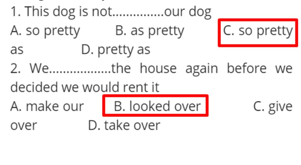 Lí do: Ở đây đang muốn nói về việc con chó không đẹp bằng con chó của chúng tôi, phải có as. Ở đây có 2 trường hợp: As+Adjective+as, So+Adjective+As, dựa vào công thức chọn C)so pretty as