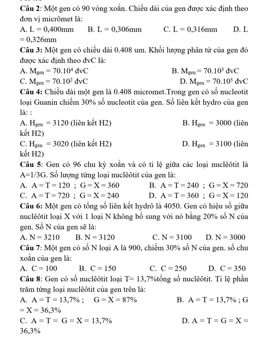 Chiều dài của gen:$L=N÷2×3,4=1800÷2×3,4=3060A^o=0,306Mm$
