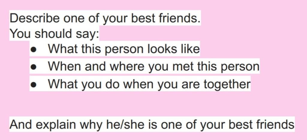 Tôi không có quá nhiều bạn bè. Tuy nhiên, tôi rất may mắn khi có một người bạn thân. Cô ấy có tên là Huong. Chúng tôi đã là bạn của nhau được 10 năm.
