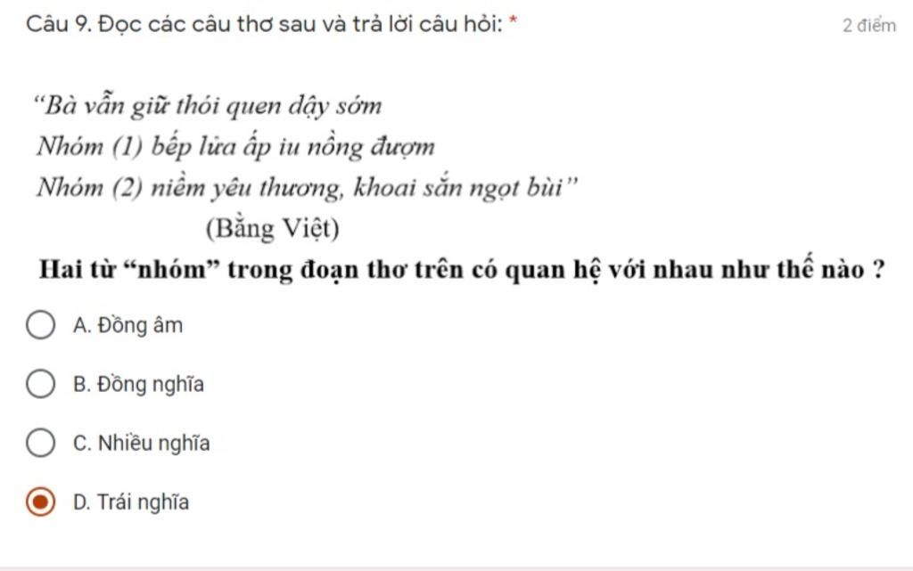 - Đáp án: D: Đồng nghĩa