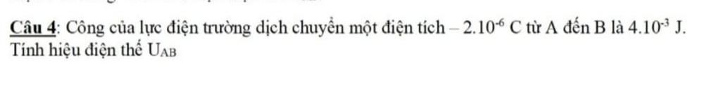 → `U_{AB}=\frac{A}{q}=\frac{4.10^{-3}}{-2.10^{-6}}=-2000 \ (V)`