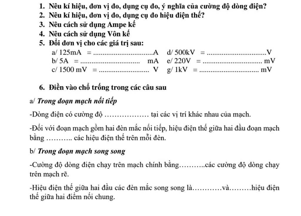 1. Nêu kí hiệu, đơn vị đo, dụng cụ đo, ý nghĩa của cường độ dòng điện?