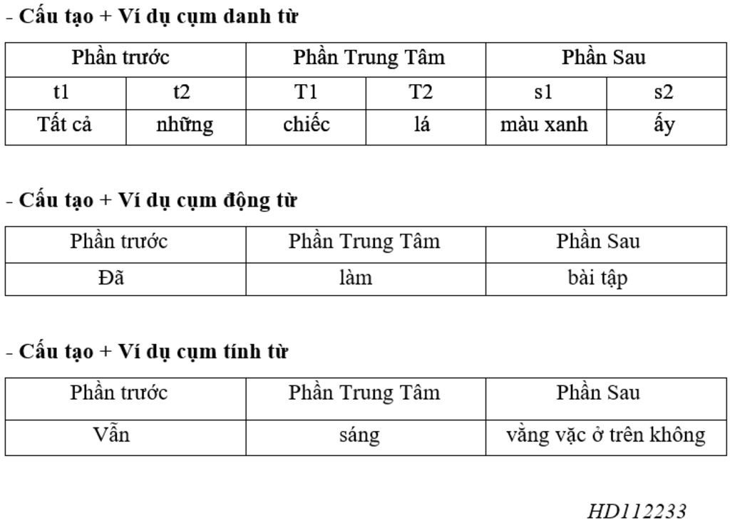 `+` Cụm danh từ : Là loại tổ hợp từ do danh từ và một số từ ngữ phụ thuộc nó tạo thành. Có cấu tạo phức tạp và ý nghĩa cụ thể hơn danh từ.