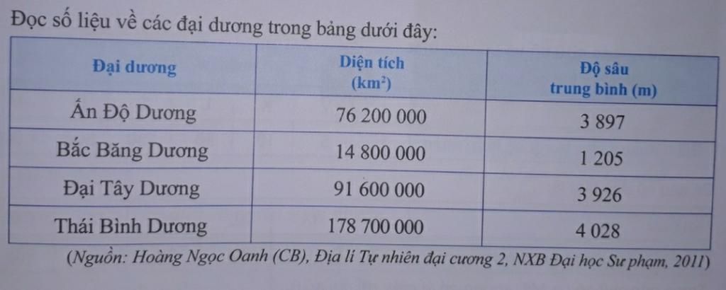 - Đại dương : Bắc Băng Dương . Diện tích : `14800000 km^2` . Độ sâu trung bình : `1295 m`