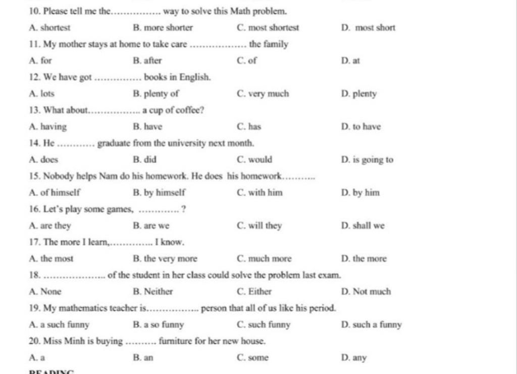 12B ( vì những cái còn lại đều sai : book ko dùng much , lots thì phải có of , plenty thì phải có of )