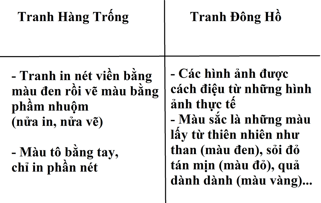 Giống nhau là tranh dân gian còn gọi là tranh Tết Khác nhau 1Tranh Đông Hồ. 2Tranh Hàng Trống Sản xuất. Bắc Ninh. Phố Hàng Trống Hà Nội Người lm. Nông dân. Nghệ nhân Cách lm. Khắc gỗ r in lên giấy. Khắc gỗ r in lên giấy Mỗi màu là một bản xuyến chỉ.Chỉ cần 1 bản gỗ.In màu trước in. gỗ khắc nét.In nước nét sau. trước r tô màu, tạo đậm nhạt Đề tài. Chúc tụng,con vật,... Tranh thờ,phong cảnh,... Bố cục. Ước lệ,thuận mắt. Cân đối,chặt chẽ Đường nét. To,chắc,khỏe. Nhỏ,mềm mại Màu sắc. Từ thiên nhiên. Từ phẩm nhuộm (màu nhẹ nhàng). (màu tươi) Rút gọnGiống nhau là tranh dân gian còn gọi là tranh Tết Khác nhau 1Tranh Đông Hồ. 2Tranh Hàng Trống Sản xuất. Bắc Ninh. Phố Hàng Trống Hà Nội Người lm. Nông dân. N... xem thêm