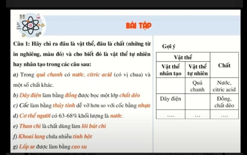 g)lốp xe là vật thể(vật thể nhân tạo),cao su là chất.