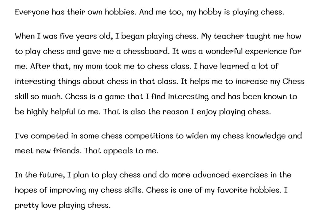 When I was five years old, I began playing chess. My teacher taught me how to play chess and gave me a chessboard. It was a wonderful experience for me. After that, my mom took me to chess class. I have learned a lot of interesting things about chess in that class. It helps me to increase my Chess skill so much. Chess is a game that I find interesting and has been known to be highly helpful to me. That is also the reason I enjoy playing chess.