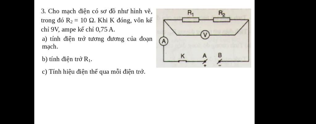 Hiệu điện thế mỗi điện trở là: vì `R_1 nt R_2 => I = I_1 = I_2 = 0,75A`