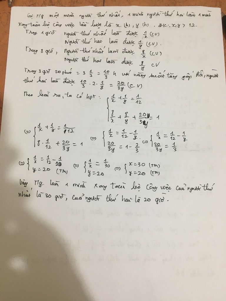 Vì hai người cùng làm chung công việc dự định trong 12 giờ thì xong nên ta có phương trình: