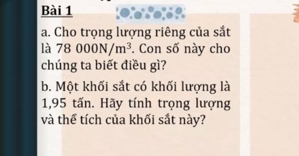 a/. Trọng lượng riêng của sắt là $d=78000N/m^3$. Con số này cho chúng ta biết rằng trong $1m^3$ sắt có trọng lượng là $78000N$