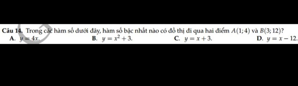 Gọi `y=ax+b\ (a\ne 0)` là hàm số bậc nhất có đồ thị đi qua hai điểm `A(1;4); B(3;12)`