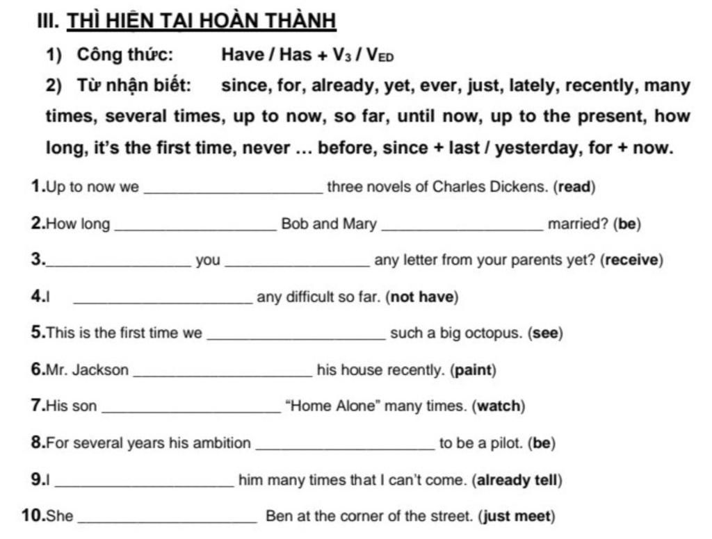 → dấu hiệu nhận bt : up to now