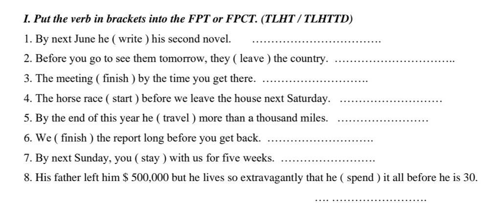 I. Put the verb in brackets into the FPT or FPCT. (TLHT/TLHTTD)