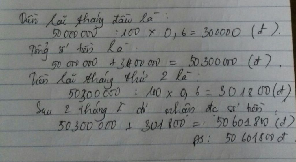 50000000 : 100 x 0,6 = 300000 (đồng)